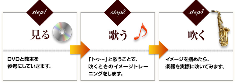 ステップ1 DVD教材と教本を参考に進める。 ステップ2 「トゥー」と歌うことで吹くときのイメージトレーニングをします。 ステップ3 イメージを掴めたら実際に楽器を吹きます。