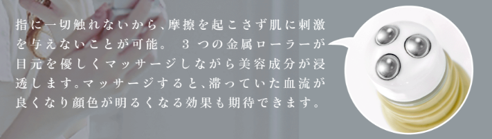 美容液容器の先端部分にステンレスローラーが3つ付いており、目元の皮膚にフィットするバランスで配置されています。